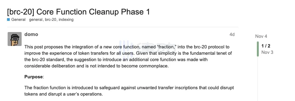 11 月 4 日,BRC20 创始人@domodata在@L1Fxyz提出了一个对 brc-20 核心功能清理的第一阶段的提案。该提案建议将一个名为「fraction」的新核心功能集成到 brc-20 协议中,以改善所有用户的代币交易体验。