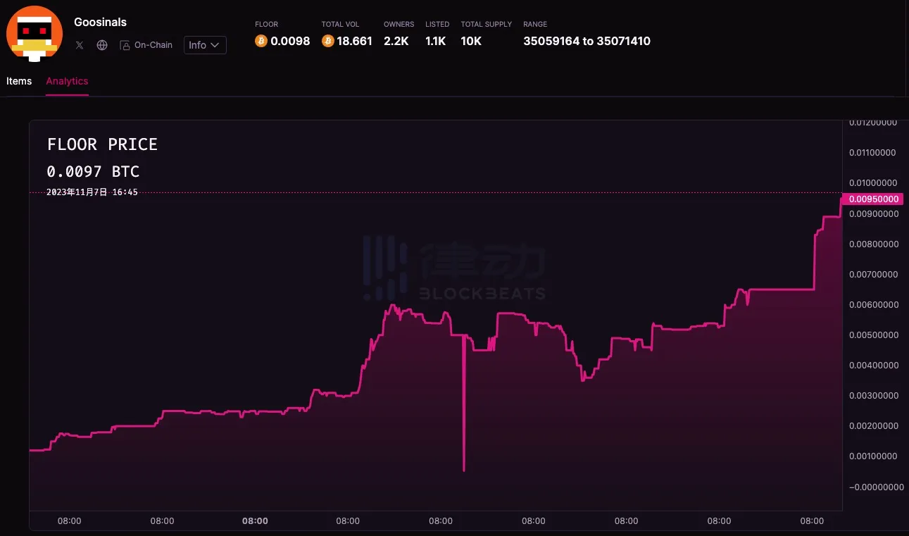 除了 BRC-20,在 NFT 市场上,以 Goosinals 为代表的比特币 NFT 的表现也引发关注。截至撰稿时,Goosinals 的地板价为 0.0097BTC(约 338 美元),近一周涨幅超 380%。