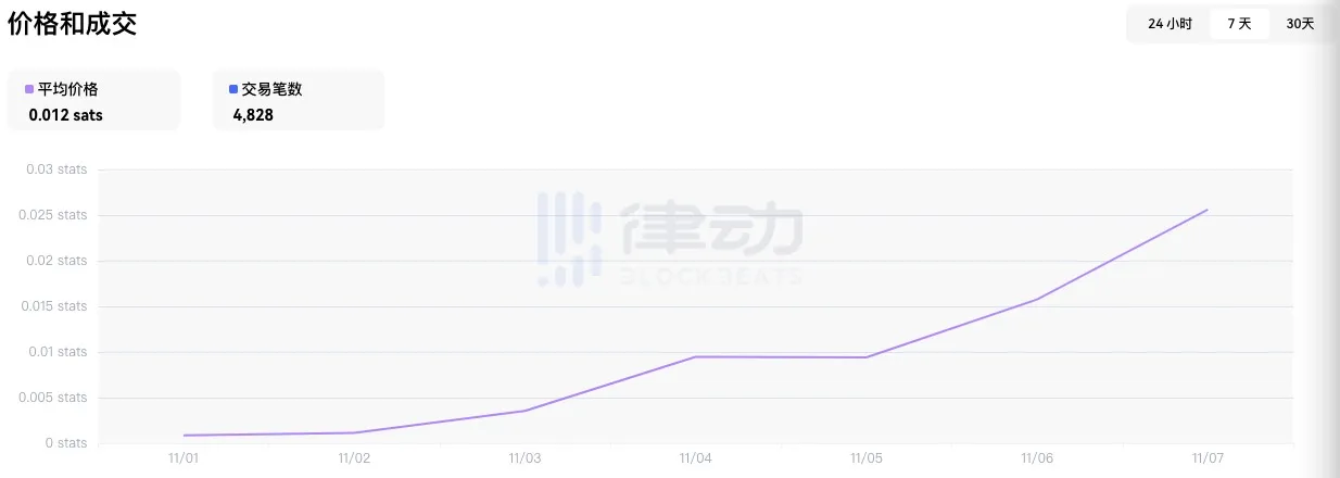从一周的交易笔数中可以看到,cats、lion 和 fish 的交易笔数都超过了社区熟悉的 BRC-20 代币 ordi,其中 10 月 31 日上线的 rats 涨幅和交易量最为突出,近一周涨幅超 389%。且一周内成交笔数为 4904 笔,仅次于 sats,而 ordi 的周交易量仅为 201 笔。