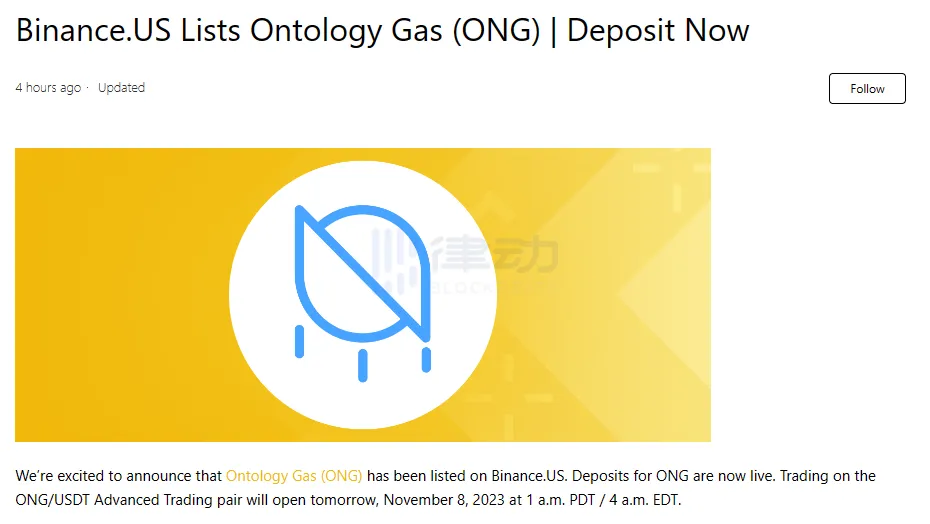 据官方公告,Binance.US 已上线 Ontology Gas (ONG)。ONG 的存款现在已经启用。ONG/USDT 交易对的交易将于太平洋夏令时间 11 月 8 日上午 1 点开始。