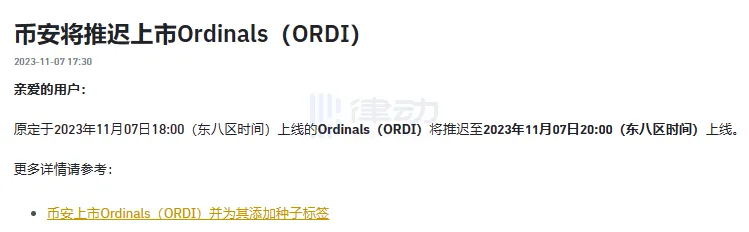 据 Binance 官方公告,原定于 2023 年 11 月 07 日 18:00(东八区时间)上线的 Ordinals(ORDI)将推迟至 2023 年 11 月 07 日 20:00(东八区时间)上线。