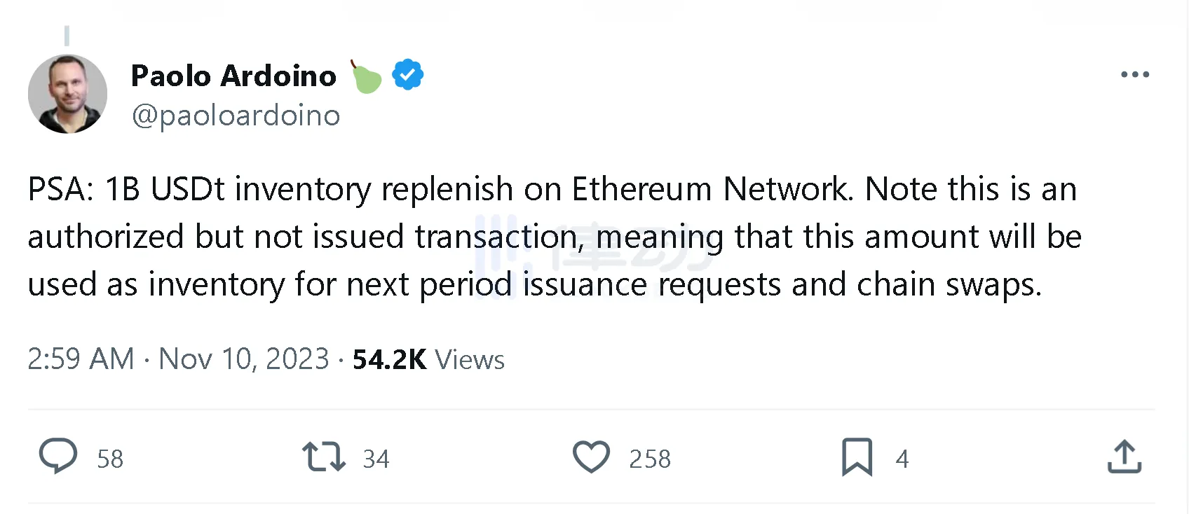 Tether 首席技术官 Paolo Ardoino 补充表示,这是一笔已授权但未发行的交易,意味着本次增发将用于下一期发行请求和链交换的库存。
