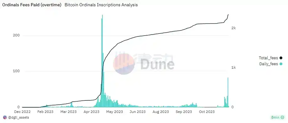 据 Dune 数据信息,11 月 9 日 Ordinals 铭文费用达 82 BTC,创 5 月中旬以来新高。