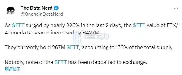 据 The Data Nerd 监测,随着 FTT 价格近两日拉升 225%,FTX/Alameda 持有的 2.67 亿枚 FTT 代币(占总供应量 76%)价值已升至 4.27 亿美元。此外,截至目前,FTX/Alameda 持有 FTT 代币暂未发送至交易平台。