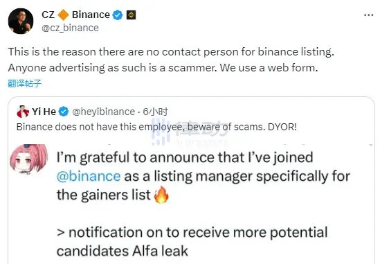 2. CZ:Binance 没有上币联系人,任何人以此自称均为欺诈;