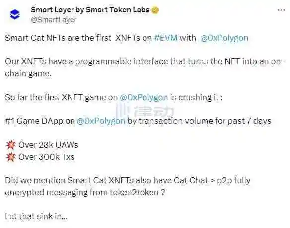 11 月 15 日,据官方消息,Smart Layer 推出的 Smart Cat NFTs 周交易笔数超 30 万,活跃钱包地址数超 2.8 万,Polygon 网络排名第一。据报道,Smart Cat NFT 为 XNFT 格式,具有可编程接口,可将 NFT 变成链上游戏。