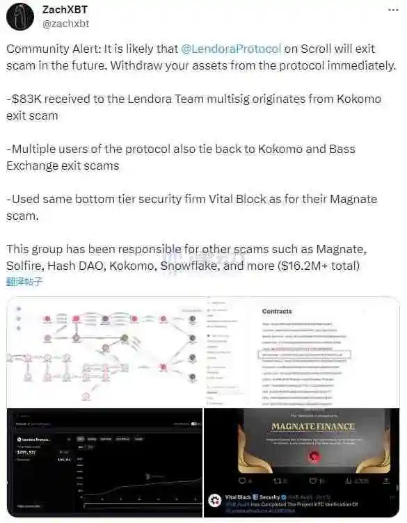 11 月 15 日,链上侦探 ZachXBT 在其社交平台表示,基于 Scroll 网络的借贷协议 Lendora Protocol 或将出现「退出骗局」。建议用户立即撤出资产。理由如下: 1、Lendora 团队多重签名收到的 8.3 万美元来自 Kokomo 退出骗局; 2、该协议的多个用户与 Kokomo 和 Bass Exchange 退出骗局有关; 3、使用与 Magnate 骗局相同的底层安全公司 Vital Block。ZachXBT 还表示,该组织还主导了其他加密诈骗,例如 Magnate、Solfire、Hash DAO、Kokomo、Snowflake 等,总涉案金额达 1620 万美元以上。