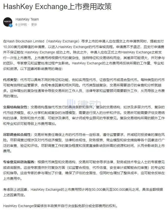HashKey Exchange 公布代币上市费用政策:预计将在 5 至 30 万美元之间