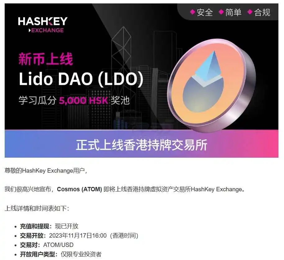 HashKey Exchange 将于 11 月 17 日面向专业投资者上线 ATOM