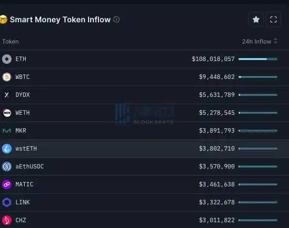 DYDX、MKR、MATIC 位居 Smart Money 24 小时流入榜单前列