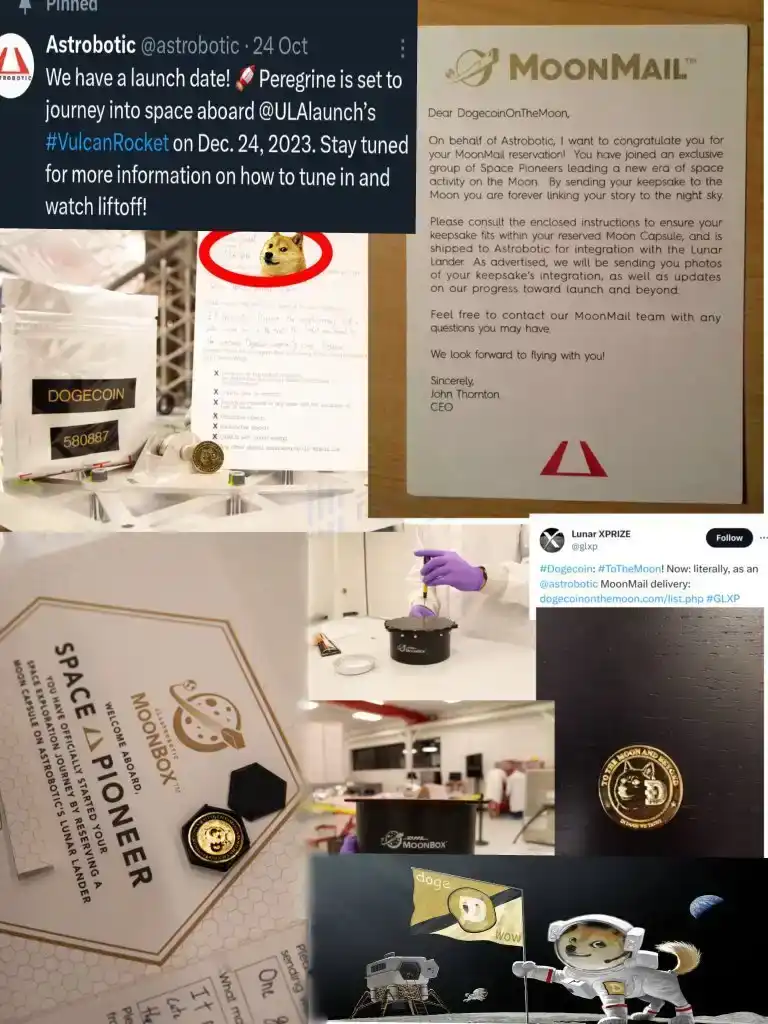 据官方消息,美国私人太空公司 Astrobotic 计划通过 ULA 的 Vulcan Centaur 火箭(火神半人马座运载火箭),在 DHL Moonbox 纪念盒中将一枚狗狗币的实体发送到月球。计划于 2023 年 12 月 23 日实施。该计划由狗狗币社区在 2015 年资助。