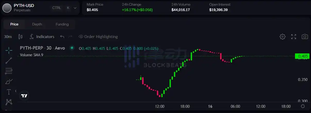 Aevo 上 PYTH 期货价格暂报 0.405 美元,24 小时涨幅 16.17%