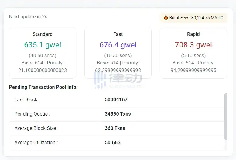 据 Polygonscan 数据,Polygon 网络 Gas 费用激增,暂报 635 gwei。