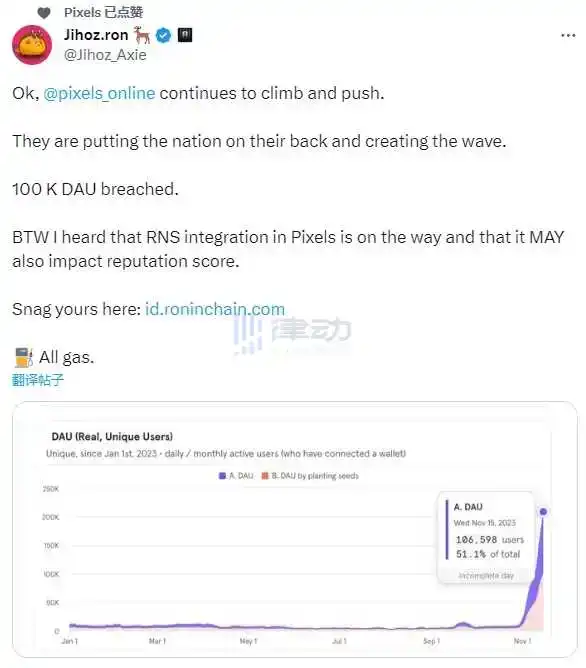 Ronin 联创:链游 Pixels 日活地址数超 10 万