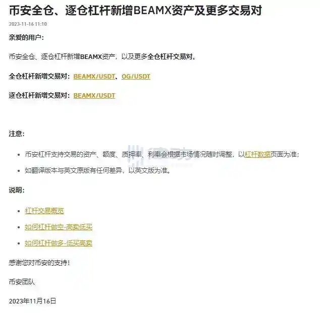 据官方公告,全仓、逐仓杠杆新增 BEAMX 资产,以及更多全仓杠杆交易对。其中: