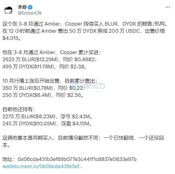 据余烬监测,某鲸鱼 12 小时通过 Amber 前卖出 50 万枚 DYDX,换成 200 万 USDC,出售价格 4.015 美元。该鲸鱼于 3 至 8 月通过 Amber、Copper 累计买入 2625 万枚 BLUR 和 495 万枚 DYDX,10 月开始逐渐卖出。目前该地址还持有 2275 万 BLUR(价值约合 823 万美元),浮亏 243 万美元,以及 245 万枚 DYDX(价值约合 1005 万美元),浮盈 415 万美元。