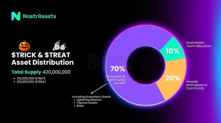 据官方消息,比特币闪电网络 Nostr Assets Protocol 正在考虑向选定的 BRC20 和 Ordinal 系列持有者空投 TRICK 和 TREAT,以进一步丰富其生态系统并扩大社区影响力。TRICK 和 TREAT 总量各 2.1 亿枚,其中: ~20% 已经空投至 Nostr Assets Protocol 社区; ~70% 致力于促进 Nostr Assets Protocol 生态系统和社区发展; ~10% 将分配给 Nostr Assets Protocol 的团队,致力于项目的长期成功。