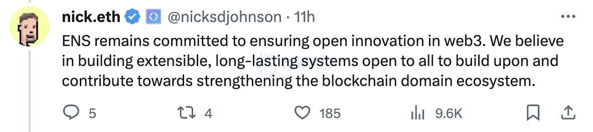 据悉,本次 Nick 公开喊话 Unstoppable Domains,是因「ENS 和 Unstoppable Domains 曾试图私下沟通,但未能取得任何进展。」