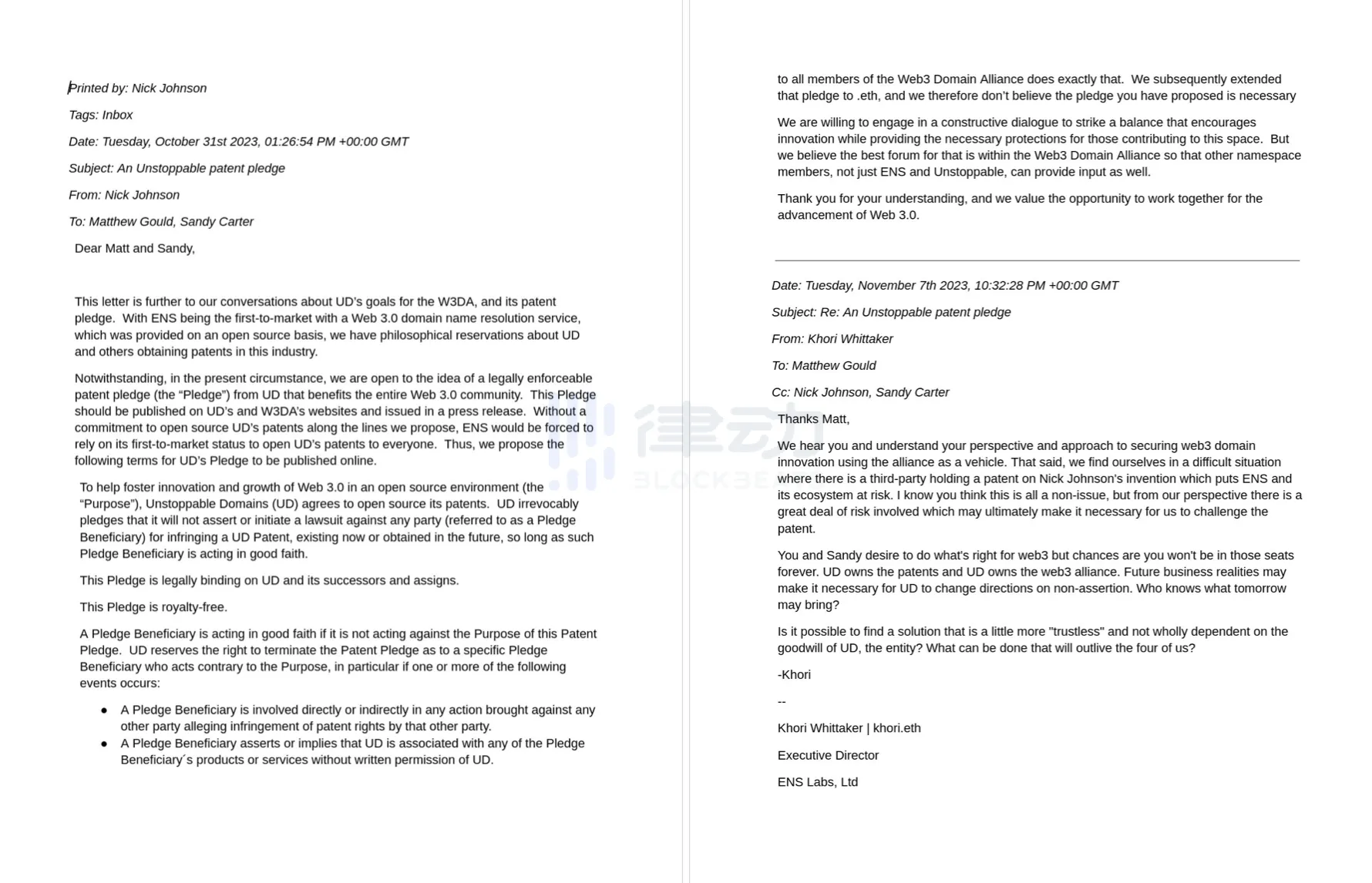 他继续表示,Unstoppable Domains 还在继续寻求申请更多专利。Nick 随后也提出了 ENS 的诉求:「任何组织在涉及其业务核心方面时,不可能依靠这样一个不具约束力的承诺。因此,我们要求 Unstoppable Domains 为其公关承诺提供法律担保,提出无条件和不可撤销的专利承诺。」