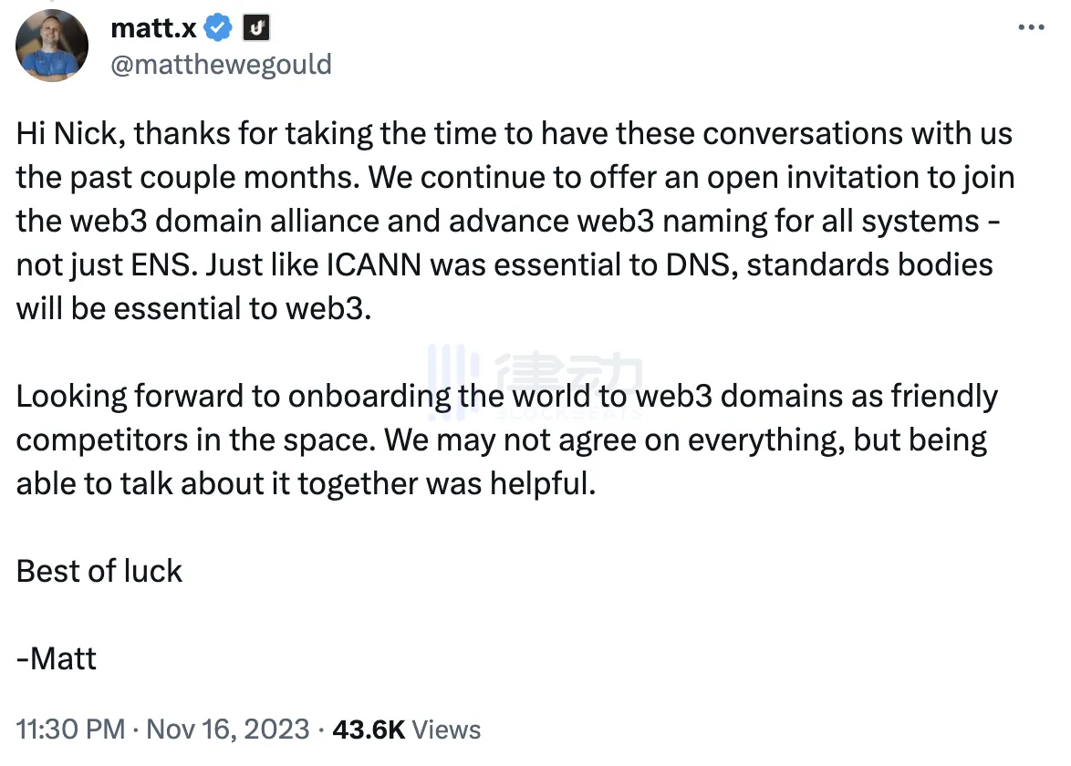 随后,Unstoppable Domains 创始人 Matthew Gould(@matthewegould)表示 ENS 提出的承诺是「没有必要的」,同时避开与 Nick 谈论核心问题,而是邀请其加入 Web3 域名联盟。