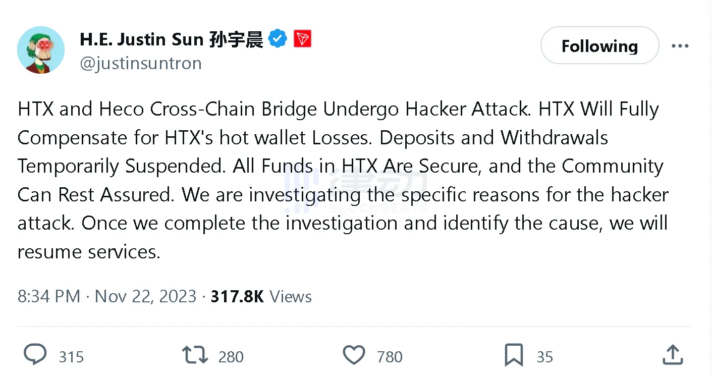 事件发生后,Justin Sun 在社交媒体发文 表示,HTX 和 Heco 跨链桥遭受黑客攻击,HTX 将全额补偿 HTX 热钱包资产损失,目前已暂停用户充提。HTX 正在调查黑客攻击的具体原因,一旦完成调查并查明原因,将恢复服务。