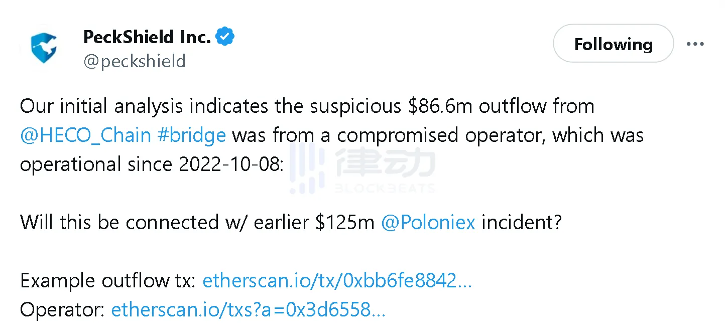 BlockBeats 消息,11 月 22 日,据派盾(PeckShield)监测,HECO Chain 跨链桥发生 8660 万美元的异常资金流出。