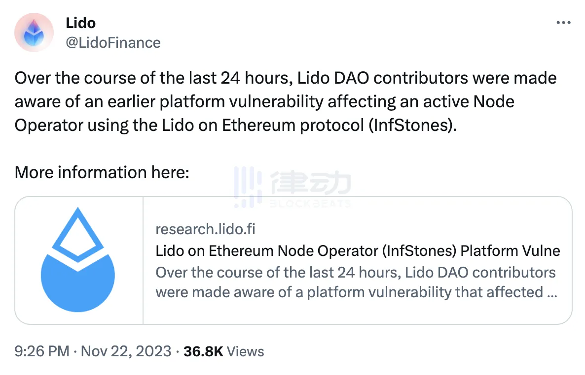 11 月 23 日,LSD 赛道龙头 Lido 官方在社交平台发文表示,在过去的 24 小时内,Lido DAO 的贡献者被告知存在一个平台漏洞,该漏洞会影响以太坊上 Lido 的活跃节点运营商 (InfStones)。目前,该漏洞问题已被解决。