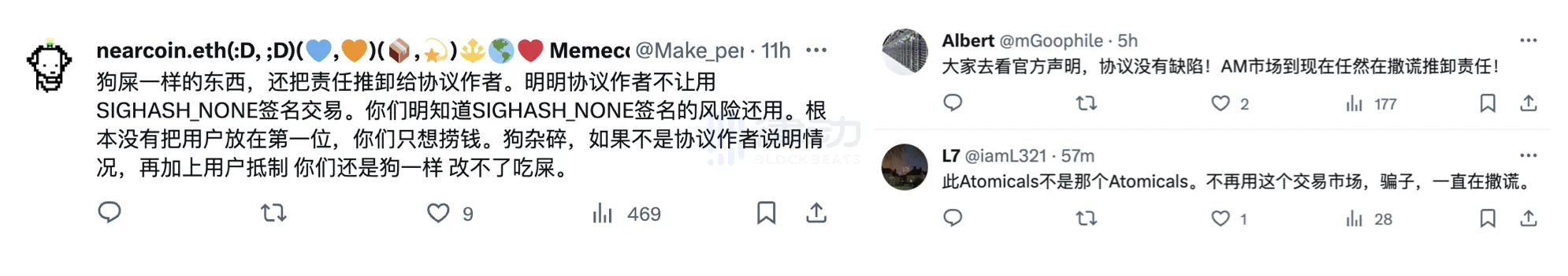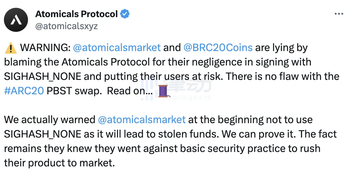 但或许谁也没想到,Atomicals Market 把这次事件的责任,推到了「正主」Atomicals Protocol 的身上。后续 Atomicals Market 将会有怎样的回应,Atomicals Protocol 是否会因此做出更多措施应对与自身无关的指责?BlockBeats 也将持续关注。