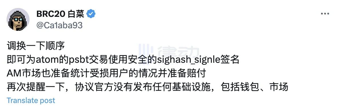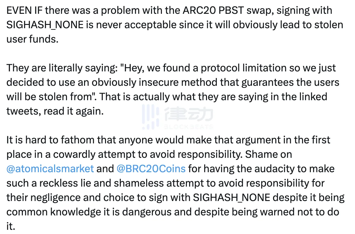 具体而言,Atomicals Market 于 11 月 24 日上午指责 Atomicals Protocol 在使用 SIGHASH_NONE 进行签名时的疏忽,让用户置于危险之中:「最近发现 Atomicals Protocol的 PBST 存在缺陷,导致用户丢失 $ATOM 代币并且无法收到这些代币的付款。」