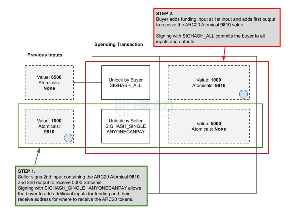 步骤 1:卖方签署包含 ARC20 Atomical 的第二个输入和第二个输出以接收付款金额,卖家使用 SIGHASH_SINGLE 签名 | ANYONECANPAY 允许买家稍后添加他们的资金输入,以及所购买的 ARC20 代币的接收地址。