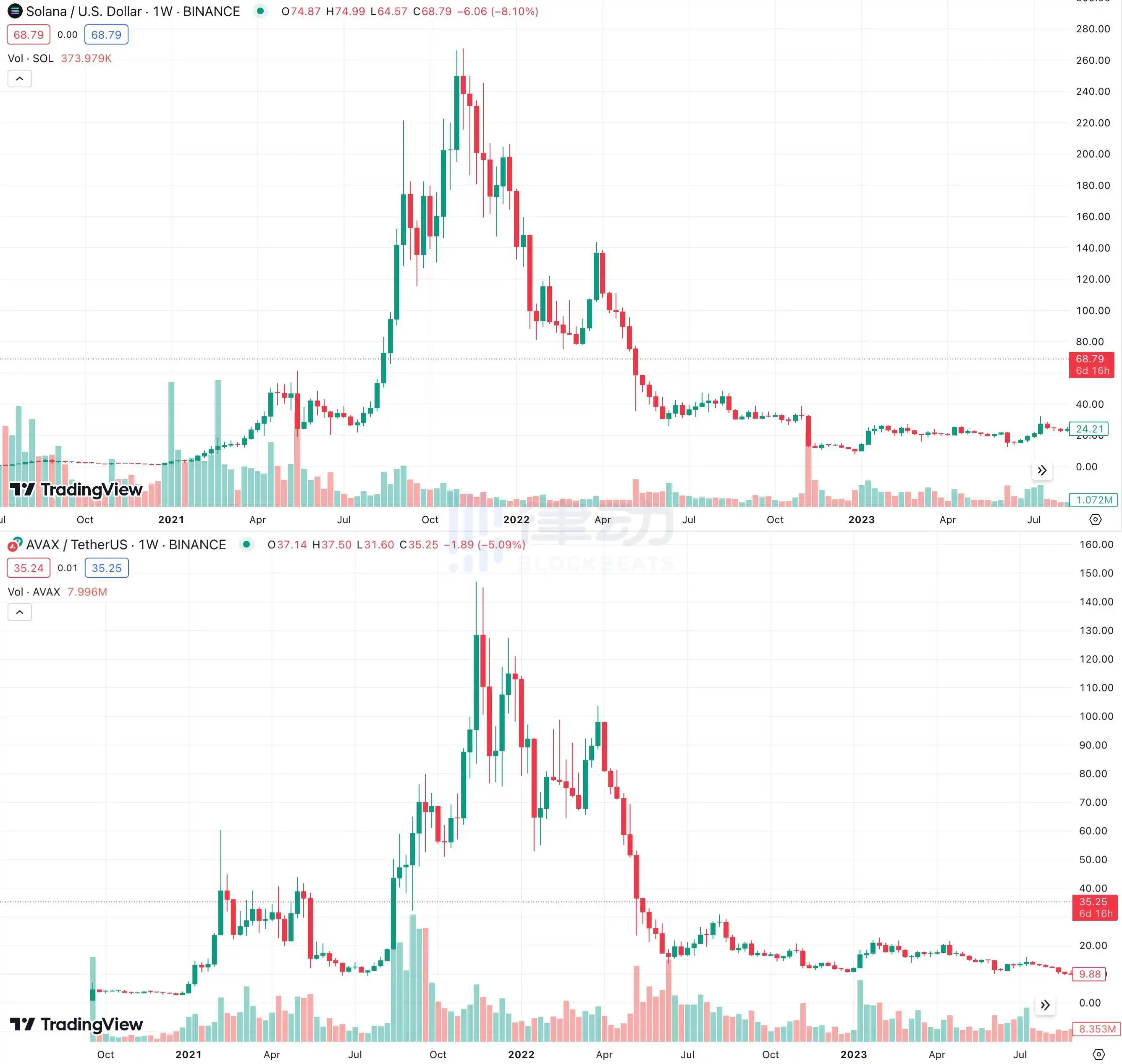 上图为SOL价格走势、下图为AVAX价格走势;图源:TradeView