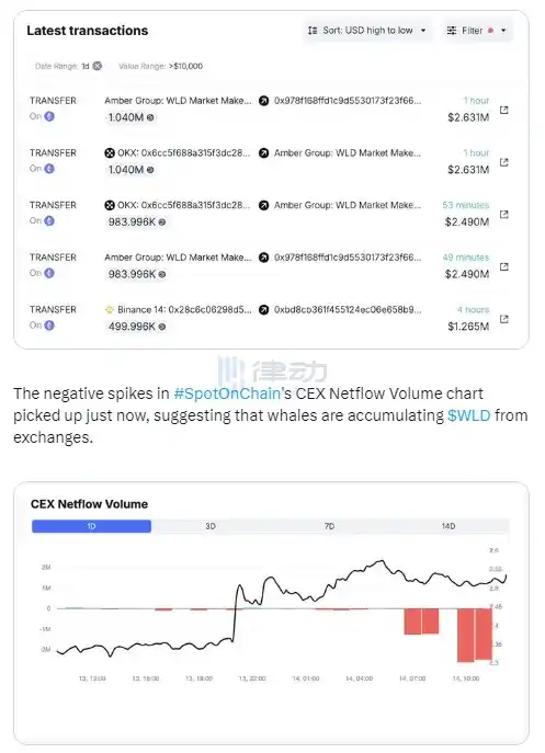 据 Spot On Chain 监测,CEX 净流量图中刚刚出现的负面波动表明,鲸鱼们正在从交易平台大量积累 WLD。加密做市商在过去的 4 小时内从交易平台提取 302 万枚 WLD(约合 761 万美元),其中: Amber Group 在大约 45 分钟前从 OKX 提取 202 万枚 WLD(约合 509 万美元); 鲸鱼 0xbd8(可能是一家做市商)在大约 4 小时前从 Binance 提取 100 万枚 WLD(约合 252 万美元)。