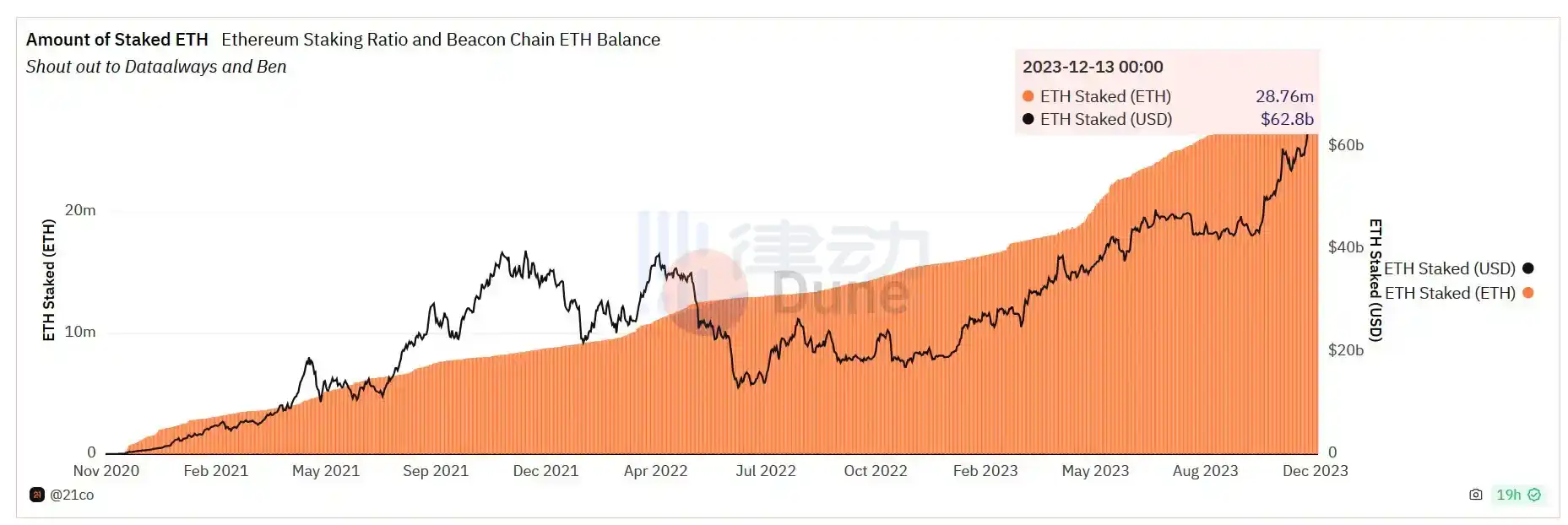 12 月 14 日,据 21.co 在 Dune 创建的以太坊质押数据仪表显示,从 2023 年 1 月到 12 月,以太坊质押量一直呈上升趋势。21.co 表示,这可能表明人们对生态系统的持续信任。尽管价格上涨,用户仍然继续质押以太坊而不是出售。
