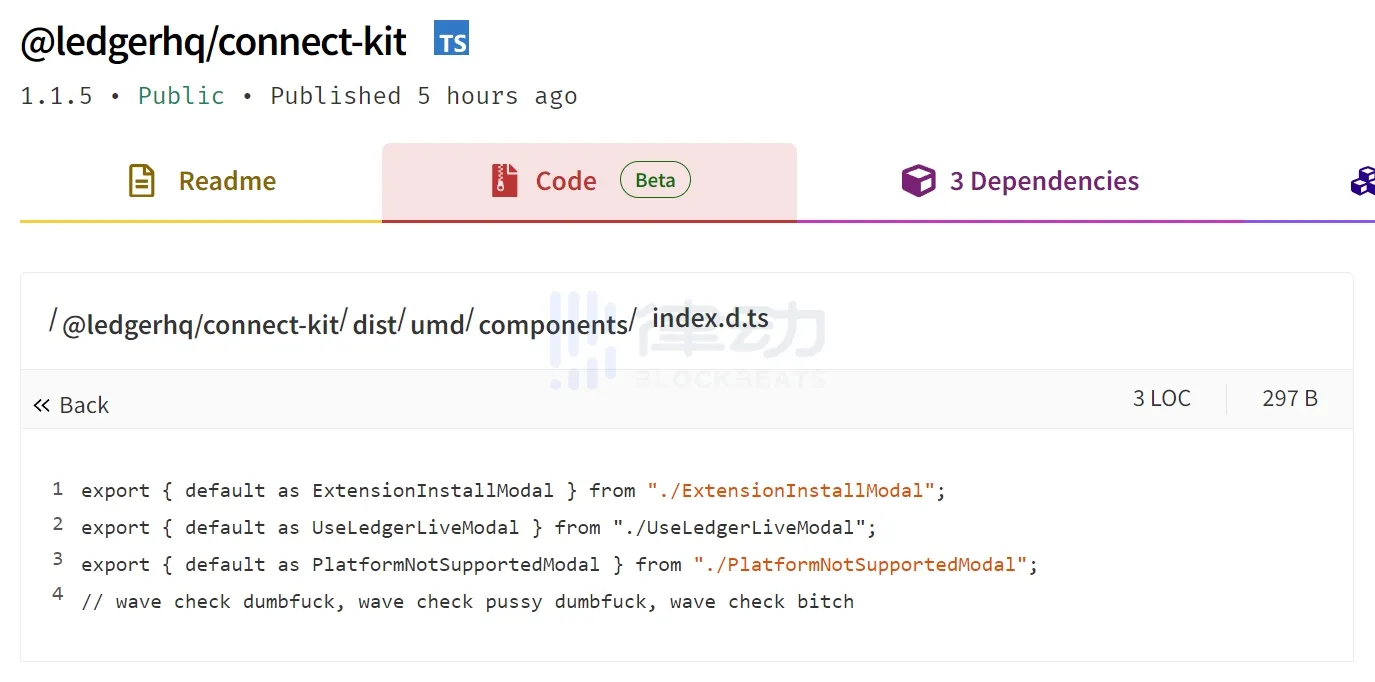 慢雾创始人余弦在社交媒体上发文表示,从代码编辑页面来看,本次 Ledger 代码库攻击团伙在 ledgerhq/connect-kit 1.1.5 版本就开始篡改了,但没有植入恶意代码,仅写入一些嘲讽信息。