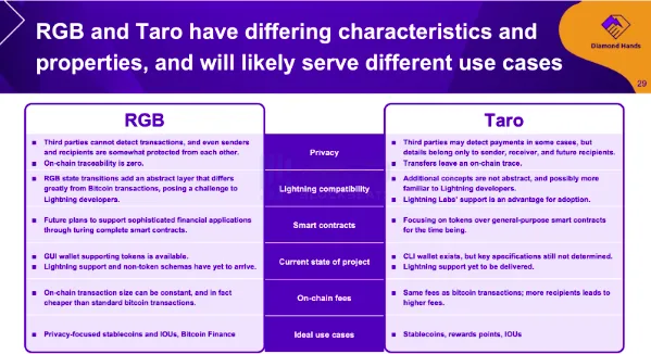 BitRGB 专注于为用户提供 RGB 资产的发行、交易,成为一站式的 RGB 资产管理平台。NA 专注的 Taproot(曾用名 TARO) 资产和 RGB 资产之间存在差异化的特点。Taproot 资产是由闪电网络开发商 Lightning Labs 在 2022 年推出的一种资产发行可拓展协议。RGB 和 Taproot 设计思路相似性很高,同样通过把数据放在链下释放比特币区块空间,并通过客户端验证保证资产交易的有效性。但 Taproot 和 RGB 也在隐私、闪电网络兼容、智能合约、费用、核心用例等几个方面呈现差异化。