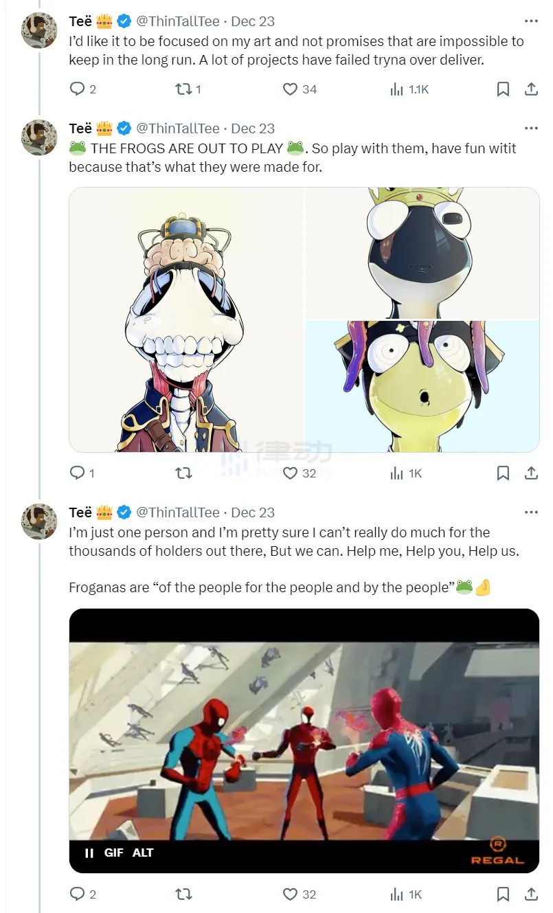 Blake 曾对 @ThinTallTee 解释称进行预售只是为了让项目拥有忠诚的早期支持者,而 Tee 对此并没有想太多,只觉得这可能是为了应对当时还不是很好的市场环境而进行的营销策略。在 200 个 Froganas 预售完成后,Blake 立即关掉了项目的 Discord 服务器然后卷款跑路。
