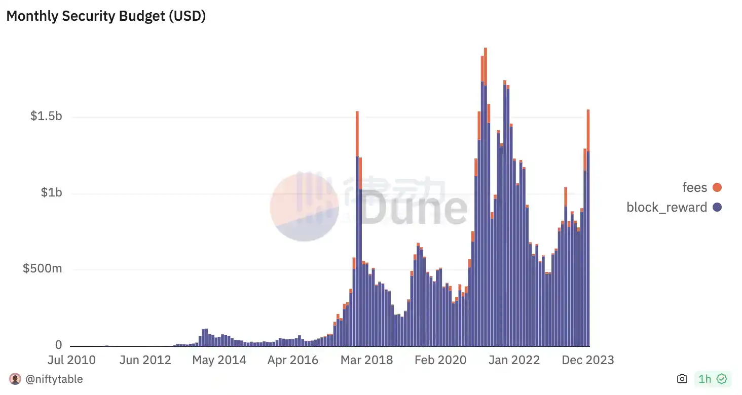 据 Dune 数据显示,比特币的安全预算(即矿工为确保网络安全所获得的收入)本月已超过 15.5 亿美元。这一数字仅比 2021 年 4 月创下的 19.6 亿美元历史最高点低约 4 亿美元。