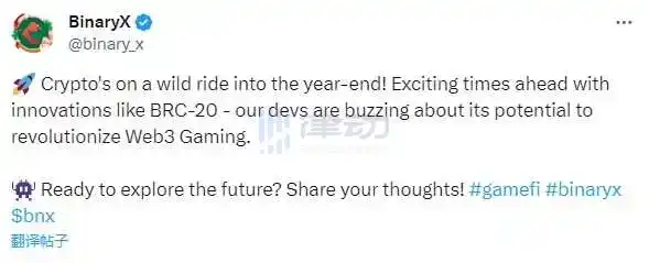 Web3 游戏平台 BinaryX 宣布 BRC20 计划,其代币 BNX 1 小时内最高涨幅近 16%