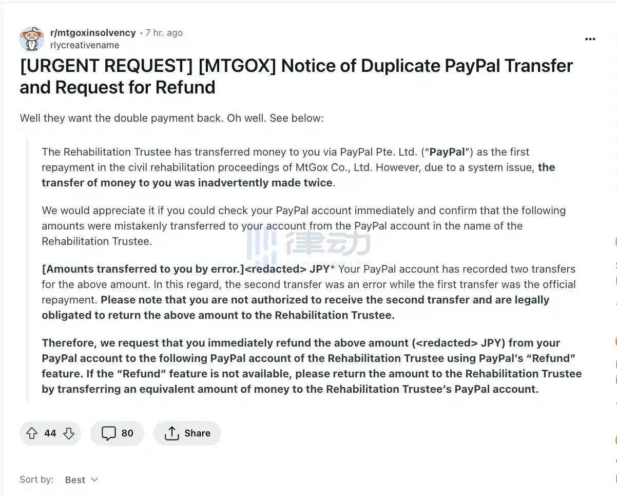 12 月 27 日,加密交易平台 Mt.Gox 的民事重建信托管理人近日通过 PayPal 向债权人进行了第一次偿还款项的转账。但由于系统故障,导致向部分债权人的转账不慎进行了两次。信托管理人已向相关债权人发出通知,请求检查其 PayPal 账户,并确认是否收到了重复的款项。若确认存在误转,管理人要求债权人立即使用 PayPal 的「退款」功能,将误转的款项(金额未公开)退回到信托管理人指定的 PayPal 账户。若「退款」功能不可用,需通过其他方式将等额款项退回。