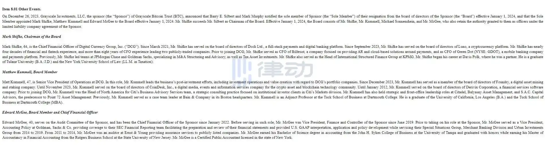 12 月 26 日,据路透社报道,DCG 创始人兼首席执行官 Barry Silbert 和 DCG 总裁 Mark Murphy 已从灰度投资董事会辞职。DCG 首席财务官 Mark Shifke 将接替 Barry Silbert 担任灰度投资董事长。据悉,Shifke 拥有近四十年的金融和金融科技经验,以及领导两家上市公司八年多的首席财务官经验。在加入 DCG 之前,Shifke 曾担任 Billtrust(一家专注于提供 AR 和基于云的支付解决方案的公司)的首席财务官,以及 Green Dot(一家移动银行公司和支付平台)的首席财务官。