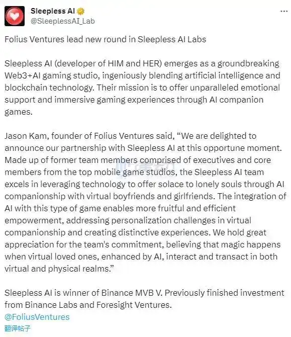 12 月 26 日,Binance 新币挖矿第 42 期项目 Sleepless AI 宣布完成 Folius Ventures 领投的新一轮融资。Folius Ventures 创始人 Jason Kam 表示:「很高兴在这个合适的时机宣布与 Sleepless AI 的合作。Sleepless AI 团队包括来自顶级手游工作室的高管和核心成员,擅长利用技术通过与虚拟男女朋友的 AI 陪伴来安慰孤独的灵魂。人工智能与此类游戏的集成可以实现更富有成效和更高效的赋能,解决虚拟陪伴中的个性化挑战并创造独特的体验。」