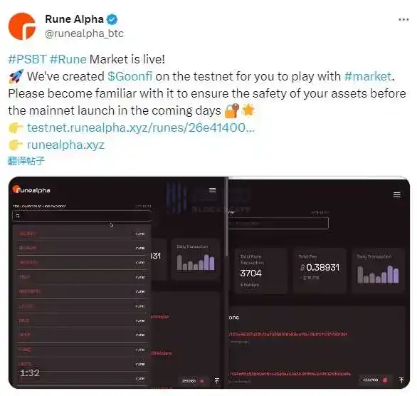 12 月 26 日,比特币铭文项目 Rune Alpha 官方表示,其交易市场测试网已上线,团队在测试网创建了测试项目 Goonfi 供用户测试交易功能。