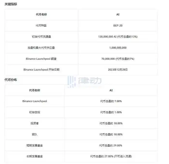 截至 2023 年 12 月 26 日,AI 代币的总供应量为 1,000,000,000,上市后的流通供应量为 130,000,000(约占代币总供应量的 13%)。关于其代币销售和经济学,代币总供应量的 7.00% 分配给 Binance Launchpool,1.00% 分配给初始空投,18.00% 分配给投资者,18.00% 分配给项目团队,29.00% 分配给短期成长基金;27.00% 分配给长期金库基金(不可流通)。