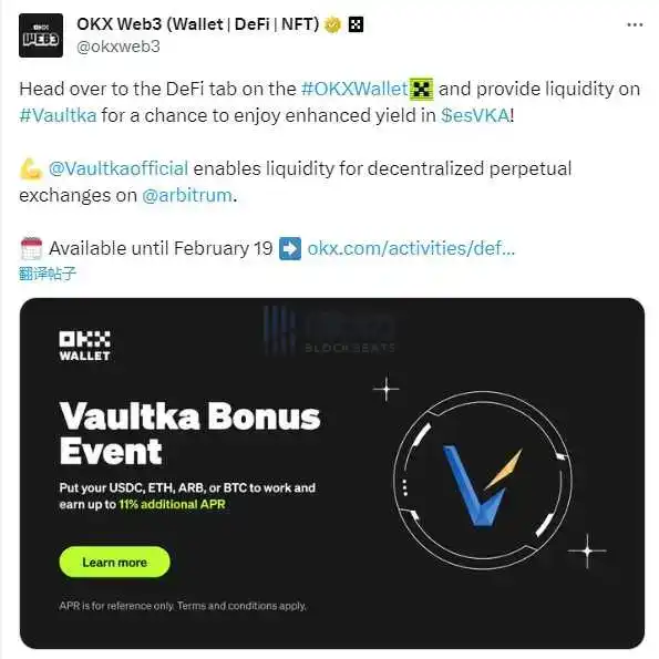 12 月 26 日,Arbitrum 生态的永续合约交易流动性平台 Vaultka 宣布与 OKX Web3 钱包进行深度整合,用户可在 OKX Web3 钱包的 DeFi 页面向 Vaultka 协议提供流动性,并在 esVKA 中享受更高的收益。