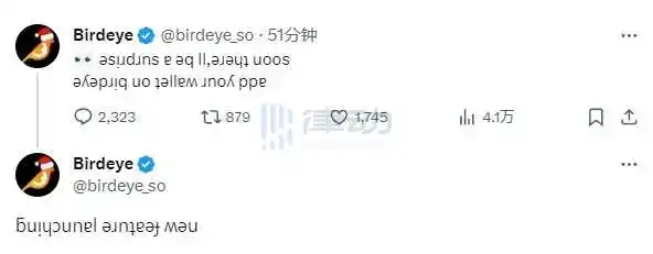 12 月 26 日,聚合器项目 Birdeye 在其社交平台用反写方式发文称「建议用户将钱包绑定 Birdeye,新功能将发布,不久将会有惊喜」。