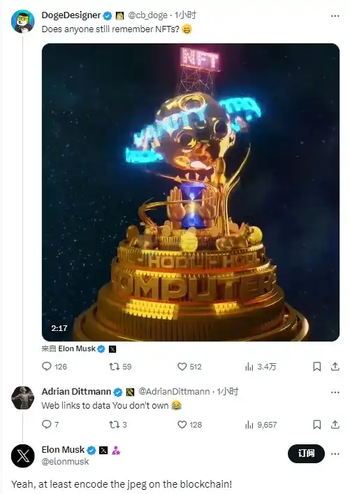 马斯克于社交平台参与相关「还有人记得 NFT 吗?」话题讨论时,回复称「是的,至少要在区块链上编码 JPEG。」