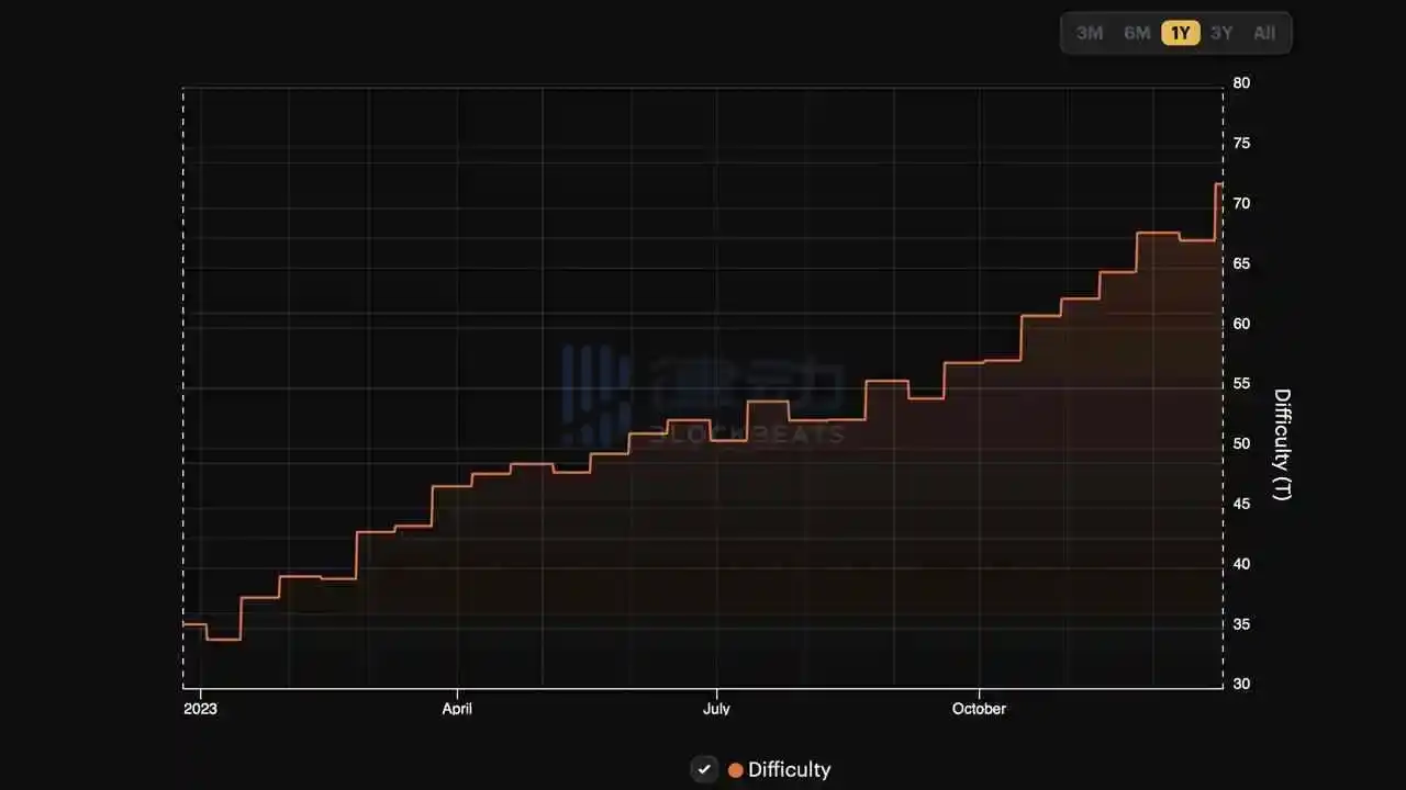 数据:2023 年比特币挖矿难度总计进行了 27 次调整,全年难度增幅达 74%