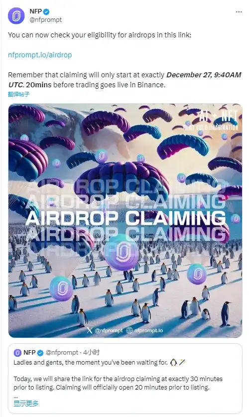 据官方消息,NFPrompt 现已公开 NFP 空投资格查询网站,并已于 17:40 开放空投申领。
