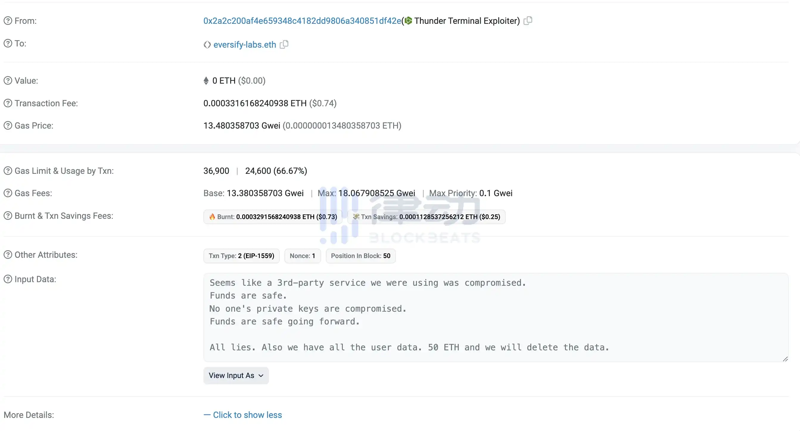 多链交易平台 Thunder 的攻击者在链上发送消息称,Thunder 对攻击事件的声明全是谎言,其拥有所有用户数据,并对删除这些数据开价 50 ETH。BlockBeats 此前报道,链上侦探 ZachXBT 发出警报称,多链交易平台 Thunder 疑似遭攻击,攻击者已将 86.5 枚 ETH 转至 ZK 隐私协议 Railgun。Thunder 对此回应称,其使用的第三方服务疑似被攻击,超过 14,000 个地址中有 114 个受到影响,但没有用户私钥信息泄漏。官方已在 9 分钟内制止了攻击,用户资金已恢复安全,并将在接下来安排赔偿。