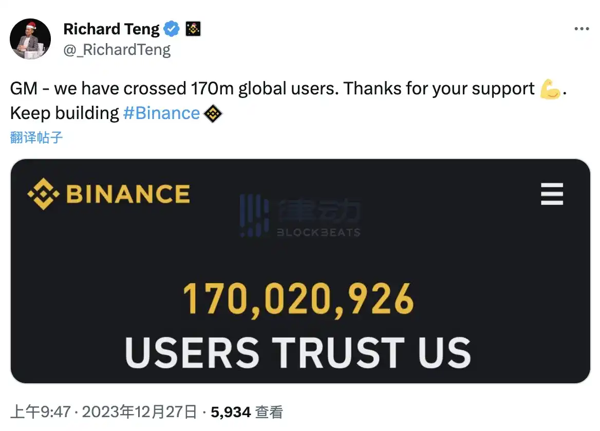 Binance 新任首席执行官 Richard Teng 在社交媒体上表示,Binance 全球用户数已突破 1.7 亿。